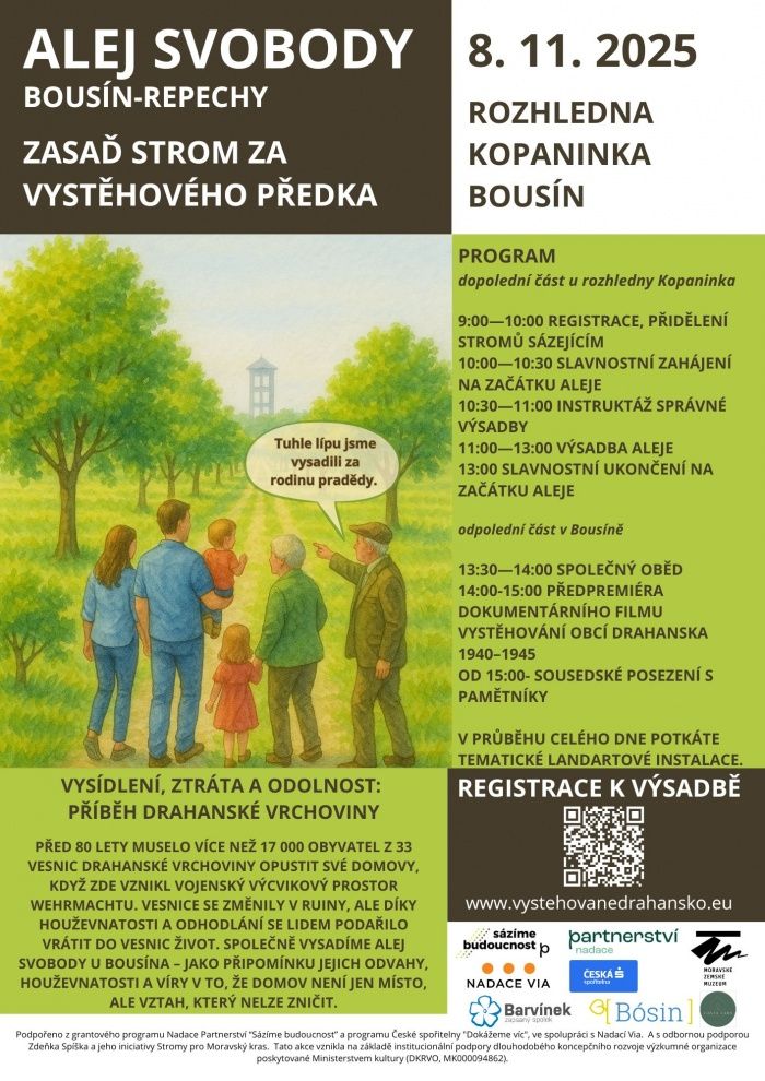 Před 80 lety muselo více než 17000 obyvatel z 33 vesnic Drahanské vrchoviny opustit své domovy, když zde vznikl vojenský výcvikový prostor wehrmachtu. Vesnice se změnily v ruiny, ale díky houževnatosti a odhodlání se lidem podařio vrátit do vesnic život. Spoleně vysadíme Alej svobody u Bousína - jako připomínku jejich odvahy, houževnatosti a víry v to, že domov není jen místo, ale vztah, který nelze zničit.