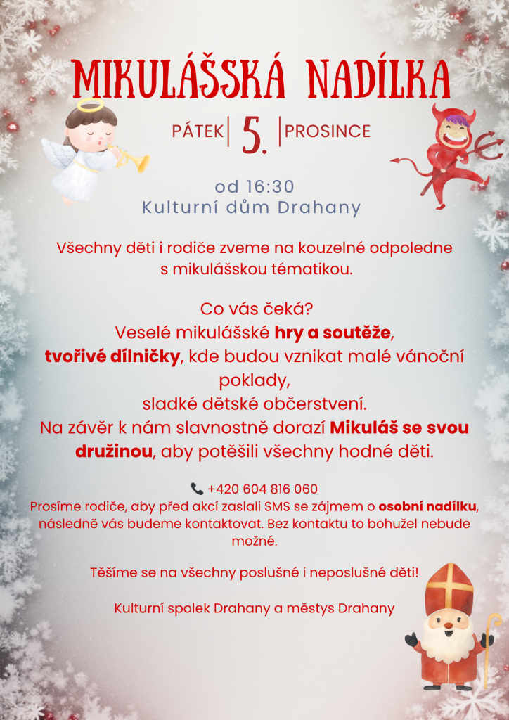 Prosíme rodiče, aby před akcí zaslali SMS na tel. 604 816 060 s potvrzením zájmu o osobní nadílku, následně Vás budeme kontaktovat.