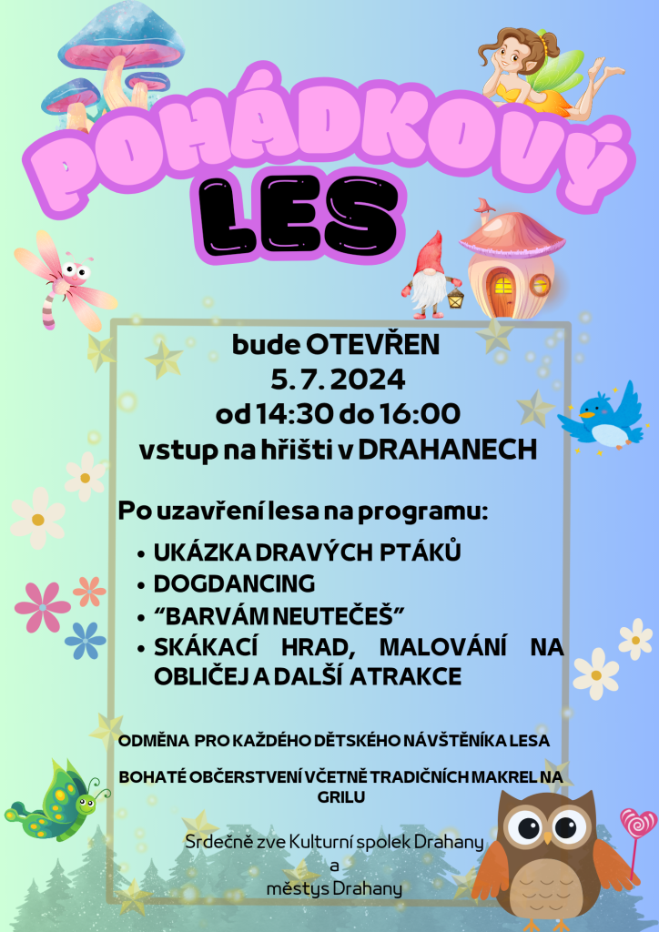 Pohádkový les bude otevřen od 14:30 do 16:00, vstup na hřišti v Drahanech.