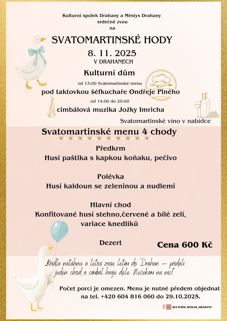 Přijďte si pochutnat na lahodné svatomartinské huse doplněné sklenkou dobrého vína. Těšit se můžete na 4 chody a cimbálovou muziku Jižky Imricha.