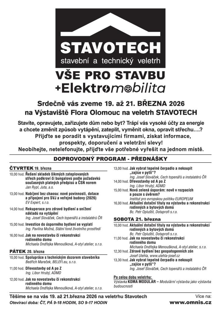 Společnost Omnis Olomouc a.s. zve všechny zájemce na 67. ročník stavebního veletrhu STAVOTECH, který se koná od 19. do 21. března 2026 na Výstavišti Flora v Olomouci. Na akci se představí firmy se širokým spektrem stavebních materiálů a služeb, včetně moderních technologií úsporného vytápění. Součástí veletrhu je také doprovodný program, který se zaměřuje na aktuální témata jako je dotace Nová zelená úsporám či přednáška o elektromobilitě. Zveme vás k aktivní účasti na této důležité události, která může přinést cenné informace pro vaše stavební plány.